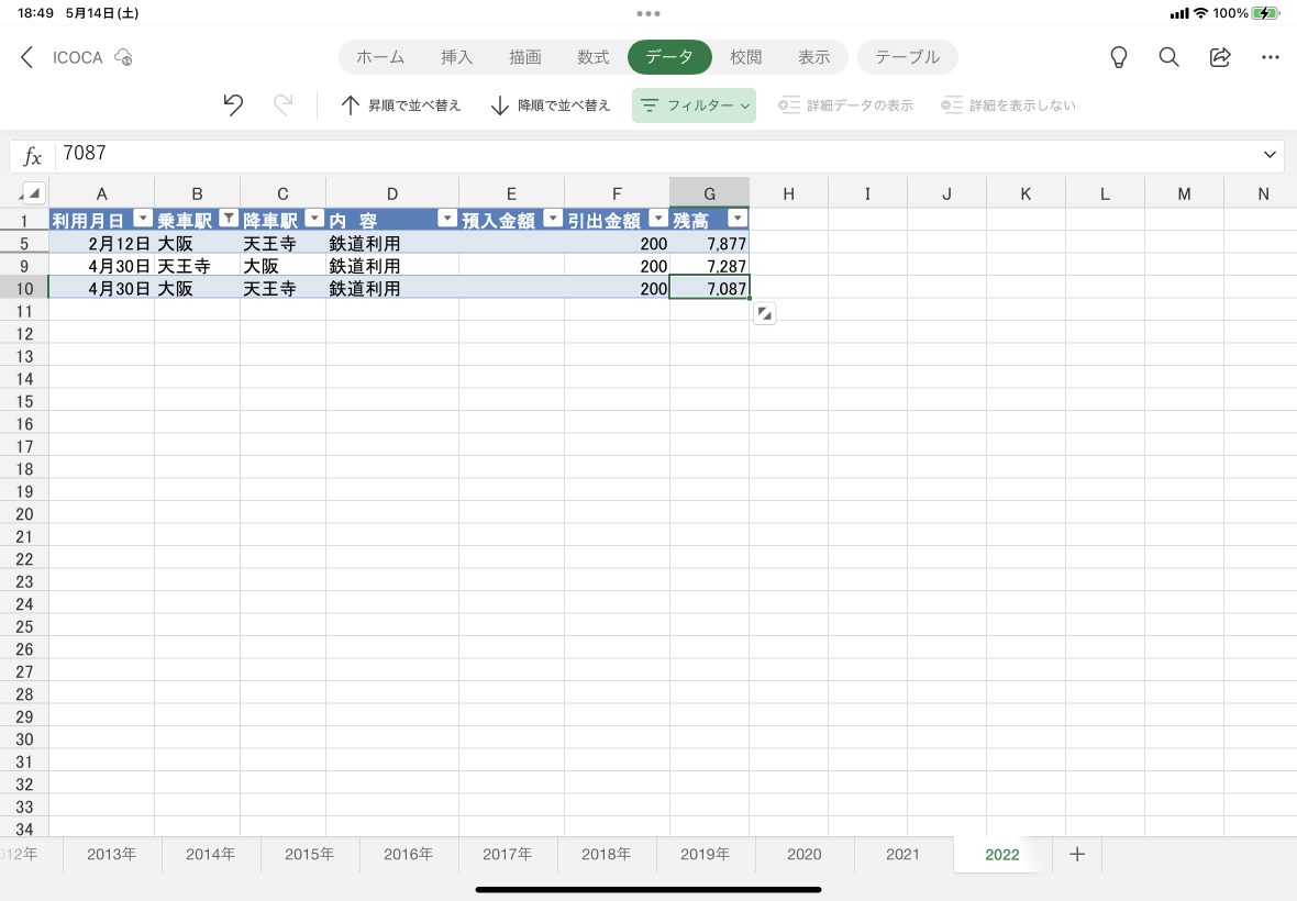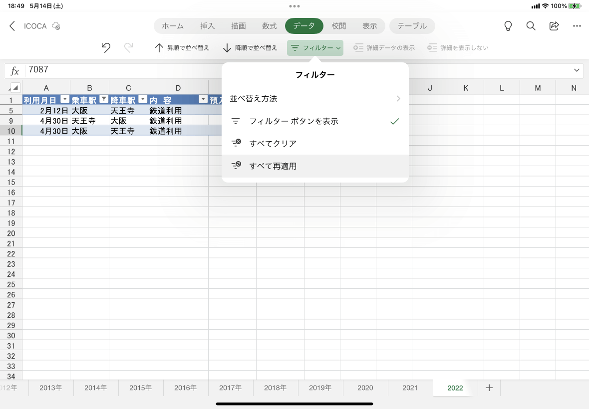 - [ホーム]タブの[並べ替えとフィルター]または[データ]タブの[フィルター]をタップします。