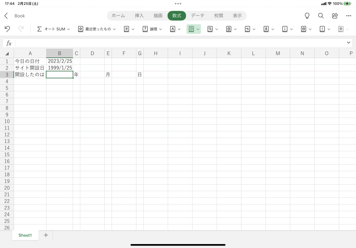 - 求めたいセルを選択し、[数式]タブの[日付/時刻]をタップします。