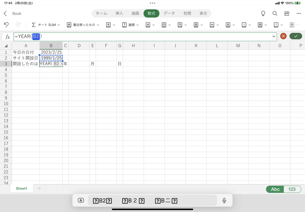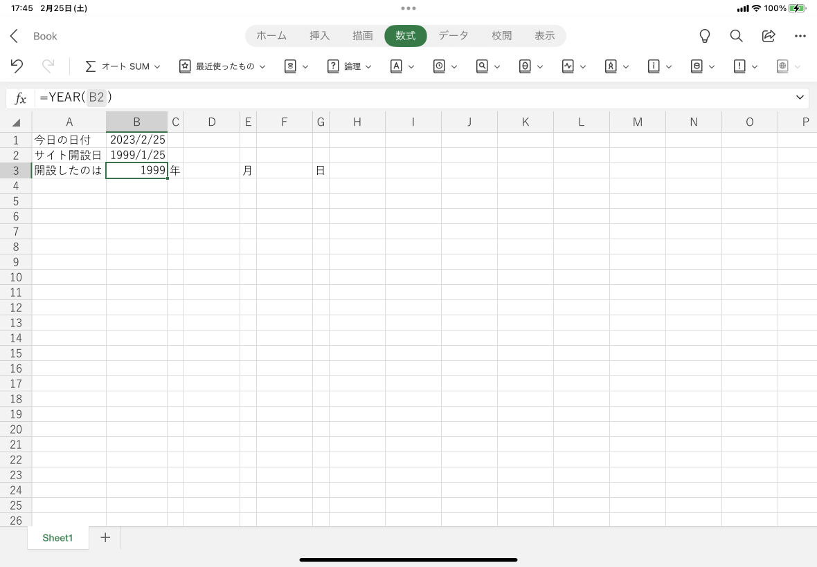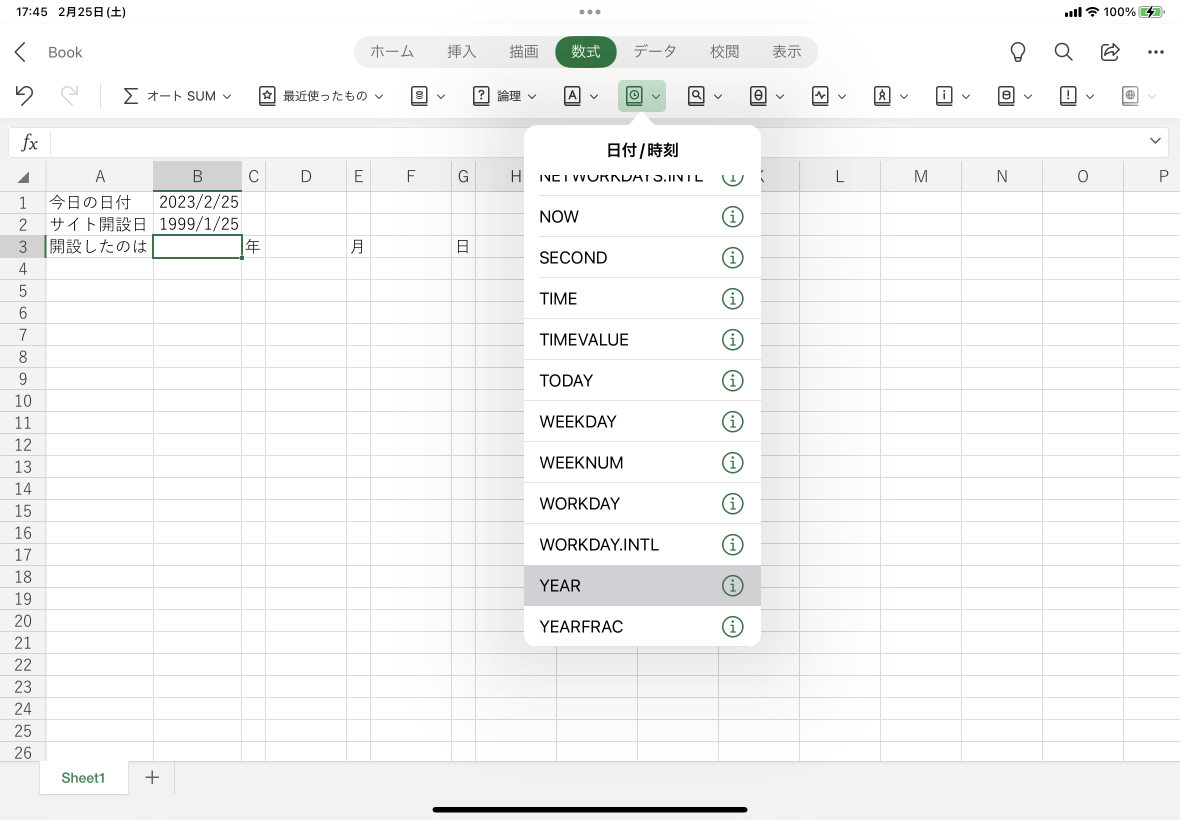 Excel for iPadで日付が入ったセルから年(1900~9999までの整数)だけを求めるには、求めたいセルを選択し、[数式]タブの[日付/時刻]関数一覧から[YEAR]関数を選択します。引数には日付が入ったセルを選択するとOKです。