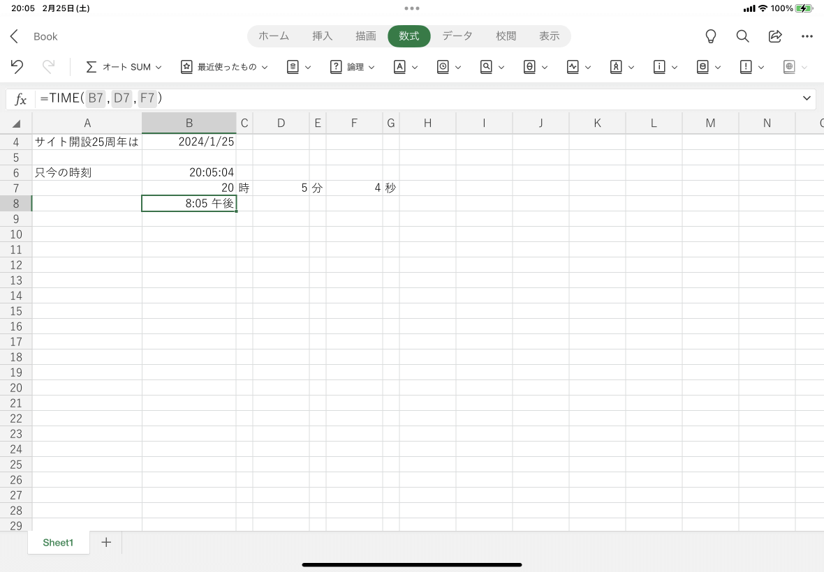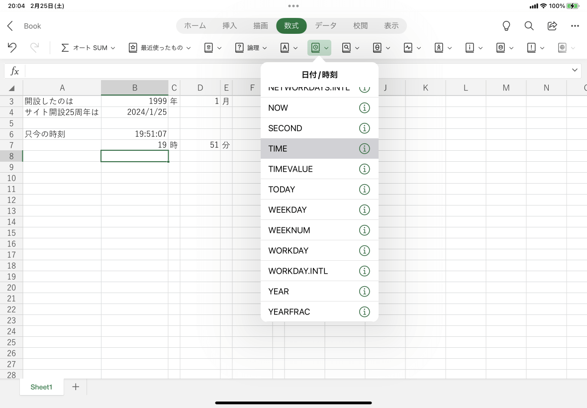 数値から時刻を求めるには、TIME関数を利用します。TIME関数を使用すると、自動的にセルの表示形式が時刻になり、1:16 AM といった表示になります。Excel for iPadで時刻を求めたいセルを選択して、[数式]タブの[日付/時刻]をタップし、一覧から[TIME]を選択します。