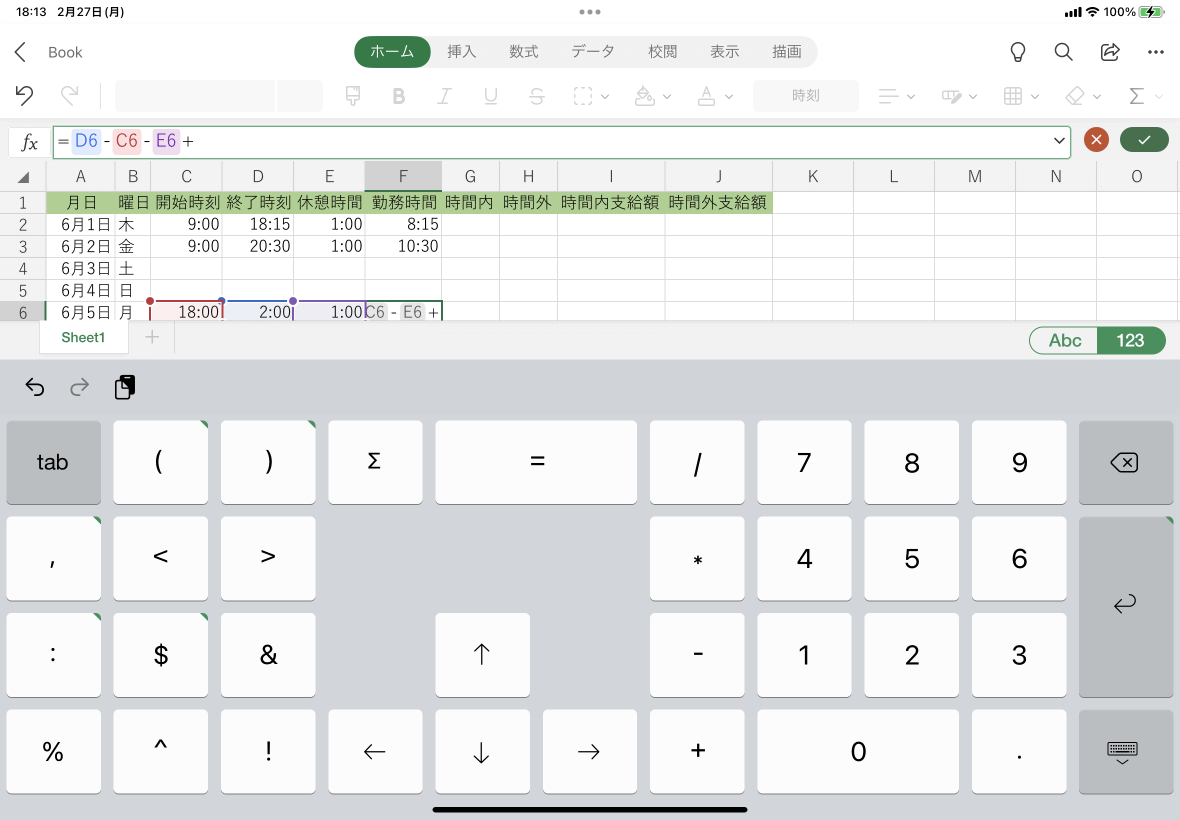 =終了時刻-開始時刻-休憩時間+と入力します。