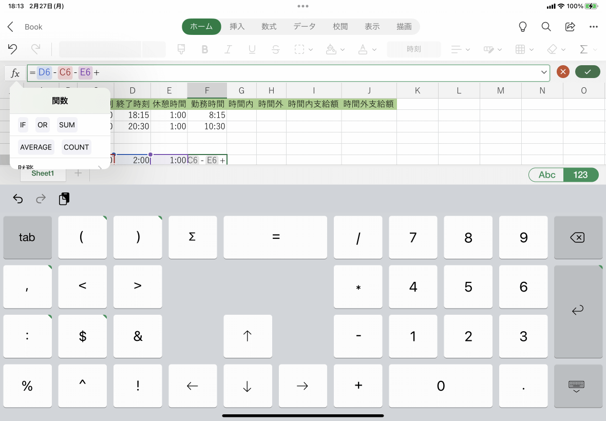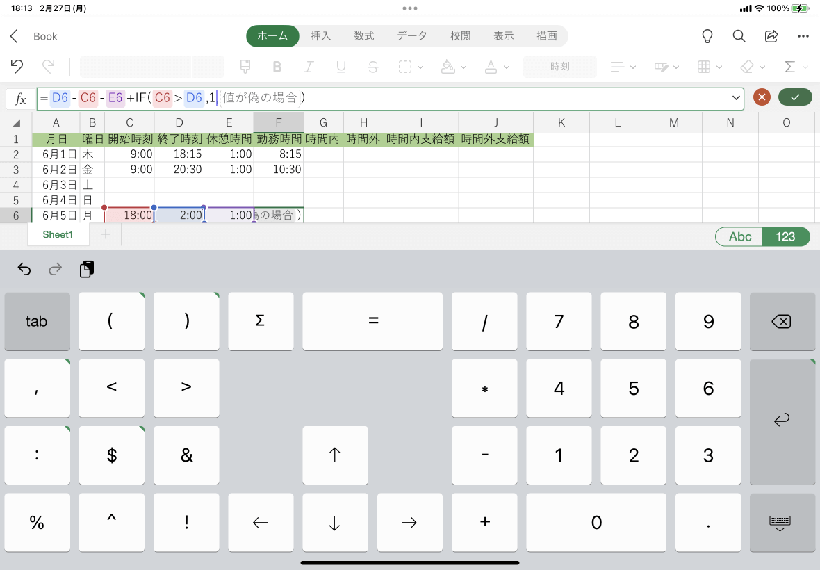 タイムシートにおいて、夜勤シフトの場合などのように、終了時刻が開始時刻の翌日になる場合の勤務時間を求めるには、Excel for iPadで終了時刻に24時間を加算して入力したほうが確実です。そうすることで深夜勤務時間を求めやすくなります。24時間を加算しない場合はIF関数の組み合わせなどで対処する必要があります。