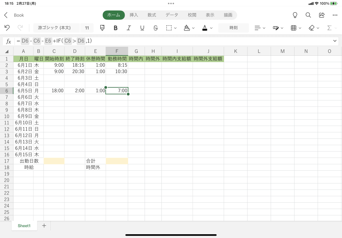 | 1 | 月日 | 曜日 | 開始時刻 | 終了時刻 | 休憩時間 | 勤務時間 | 時間内 | 時間外 | 時間内支給額 | 時間外支給額 |