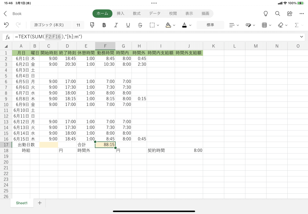 残念ながらExcel for iPadでは、ユーザー定義のセルの書式の設定ができません。その代わり、時間の合計を引数にしたTEXT関数を利用することで、24時間を超える時間の合計を表記することが可能です。