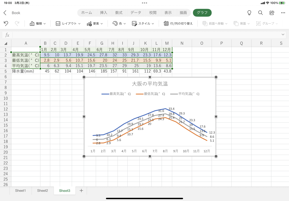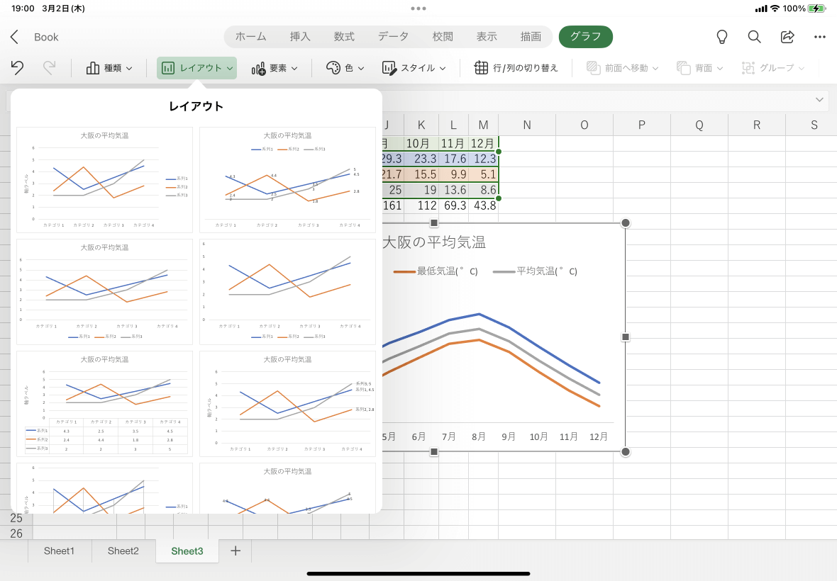 - グラフを選択し、[グラフ]タブを開き[レイアウト]をタップします。