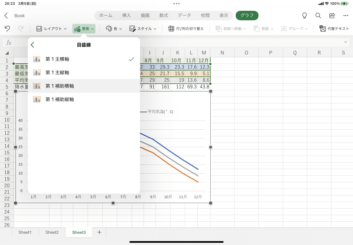 Excel for iPadでプロットエリアに補助目盛線を引くには、グラフを選択して[グラフ]タブを開き、[要素]一覧より[目盛線]を選択して[第一補助縦軸]または[第一補助横軸]を選択します。