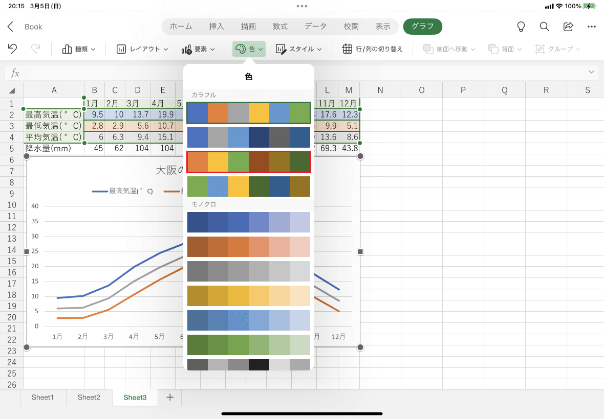 白黒印刷でもグラフの各要素の区別を明確にするために、配色を後で変更することができます。Excel for iPadでグラフを選択して[グラフ]タブを開き、[色]を選択して、一覧から配色パターンを選択します。