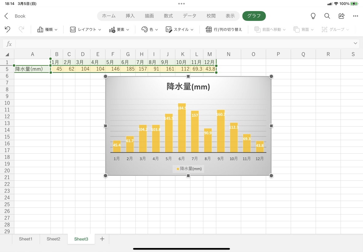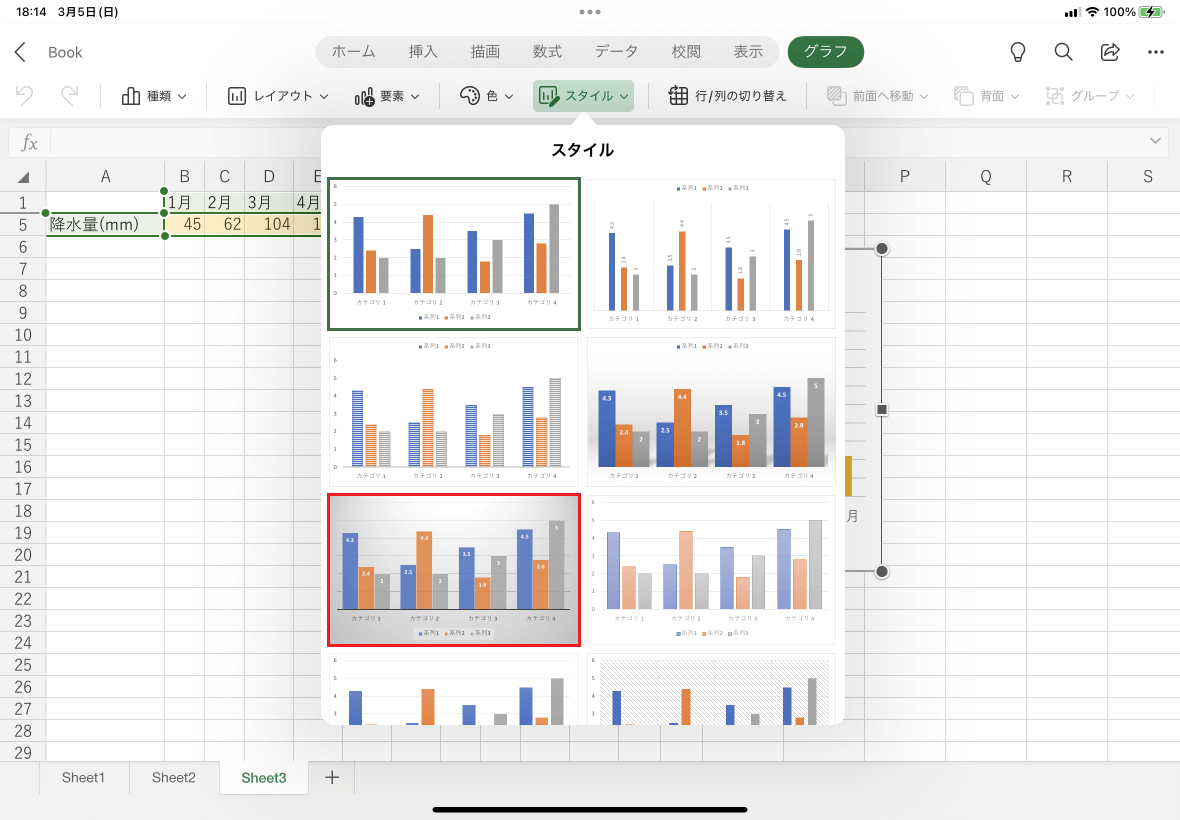 Excel for iPadでグラフを選択して[グラフ]タブを開き、[スタイル]より適用したいスタイルを指定します。