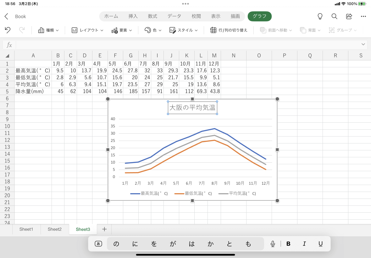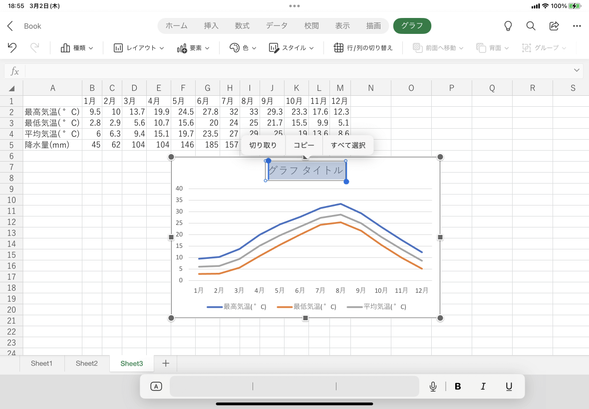 Excel for iPadでグラフを作成すると、既定で「グラフタイトル」という文字が入ったグラフタイトルがつきます。この文字を変更するには、そのグラフタイトル部分をダブルタップして、文字を入力しなおすとOKです。