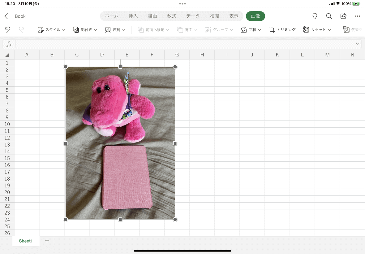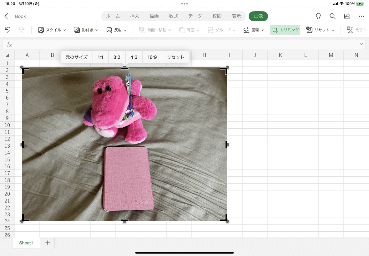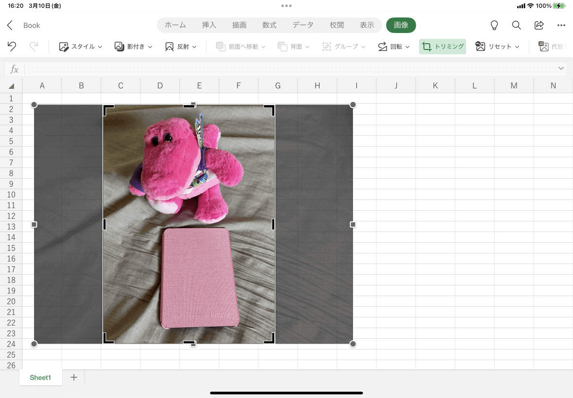 Excel for iPadでトリミングしたい図を選択して[画像]タブを開き、[トリミング]をタップして、ハンドルを使って図をトリミングします。