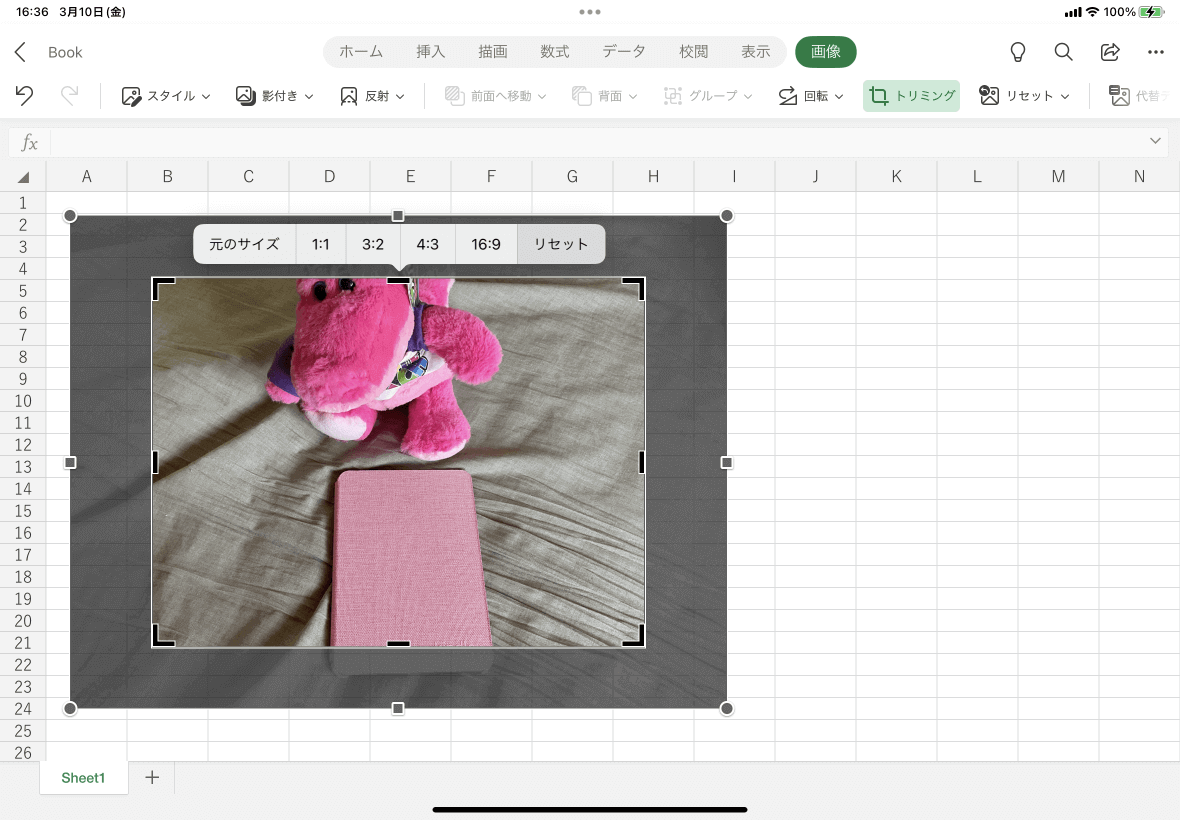 トリミング対象となる図を選択してExcel for iPadの[画像]タブを開き、[トリミング]をタップして、ポップアップメニューから[リセット]をタップします。