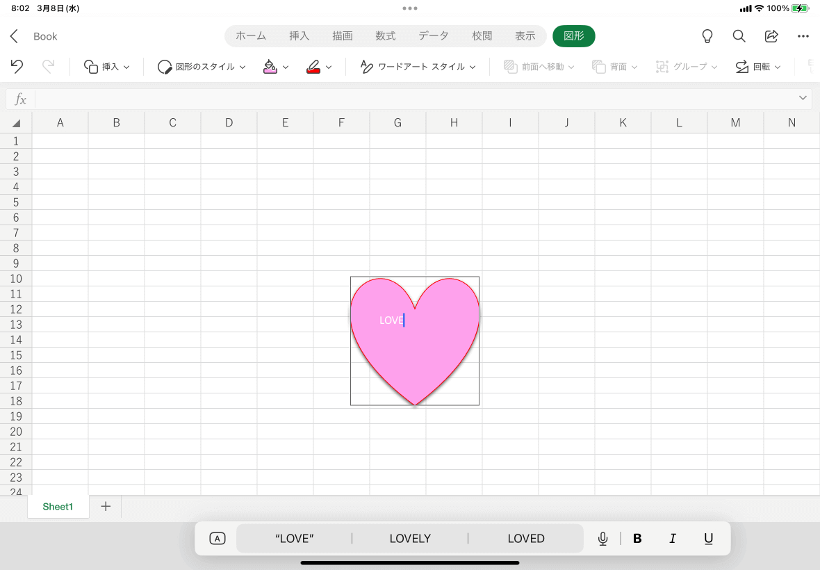 Excel for iPadで文字を入れたい図形を選択して、ポップアップメニューから[テキストの編集]を選択すると、図形内にカーソルが表示され、文字入力できるようになります。