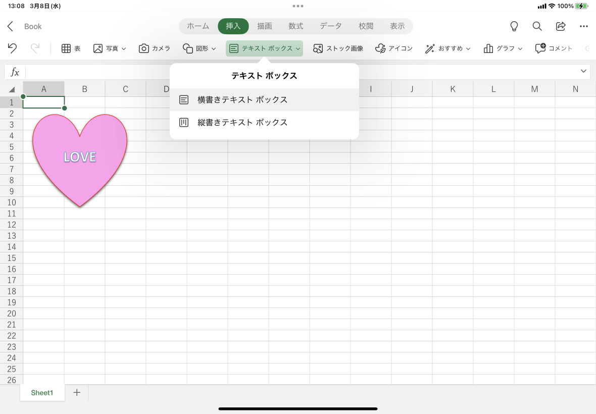 Excel for iPadで[挿入]タブを開き、[テキストボックス]から[横書きテキストボックス]または[縦書きテキストボックス]を選択します。