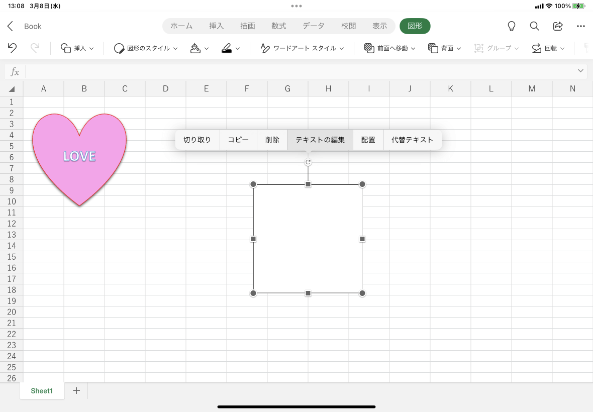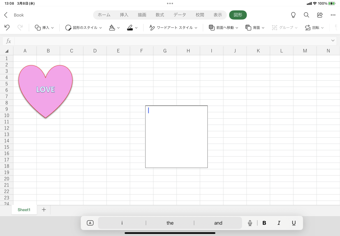 Excel for iPadでワークシートにテキストボックスを挿入した直後はその中にカーソルが表示されません。文字を入力するにはそのテキストボックスを選択してポップアップメニューから[テキストの編集]をタップします。