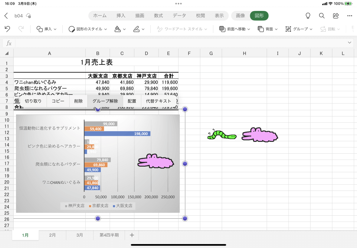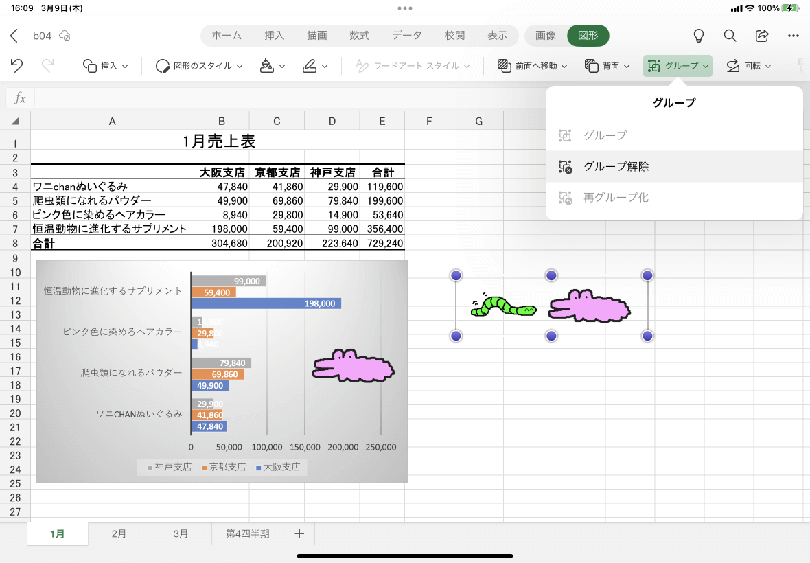 - グループ化されたオブジェクトを選択して、ポップアップメニューから[グループ解除]を選択します。