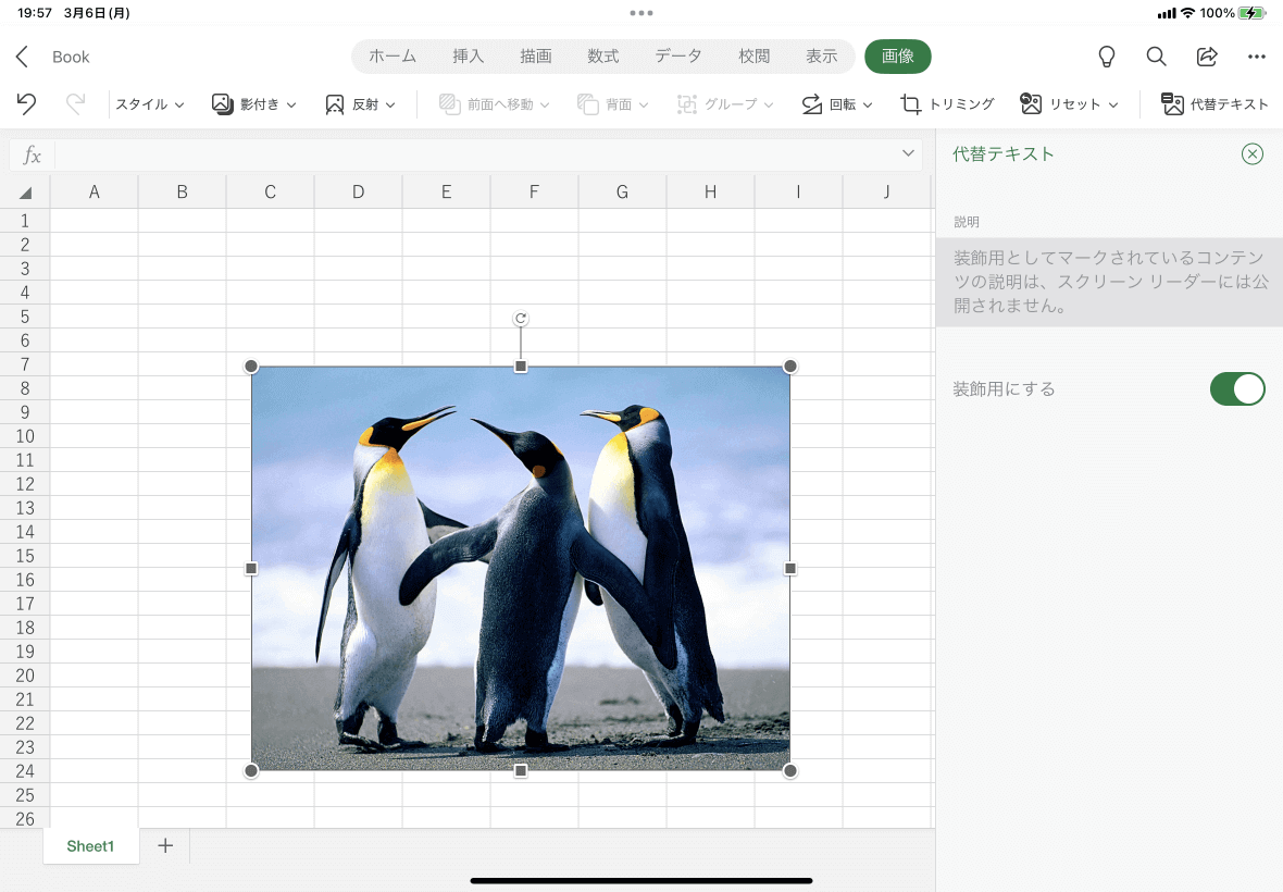 図や図形などのオブジェクトを見たり理解するのが困難な、視覚障碍や認識障碍のある方にとって役立つように、代替テキストを設定するには、対象となるオブジェクトを選択して[代替テキスト]コマンドをタップし、[代替テキスト]ウィンドウに説明を入力します。装飾用のオブジェクトの場合は、[装飾用にする]のスイッチを入れておくとOKです。