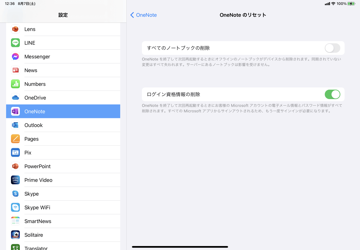 次にOneNoteを終了して再起動するときに、Microsoft関連のメールとパスワードの情報をすべて削除するには、[設定]から[OneNote]をタップして、[OneNoteのリセット]をタップし、[ログイン資格情報の削除]のスイッチをONにします。すると、Microsoftアカウントからサインアウト状態となるため、次回OneNote起動時にサインインする必要があります。