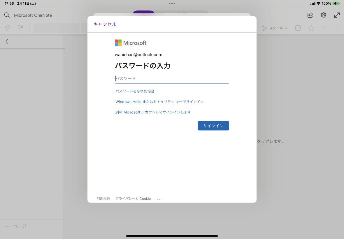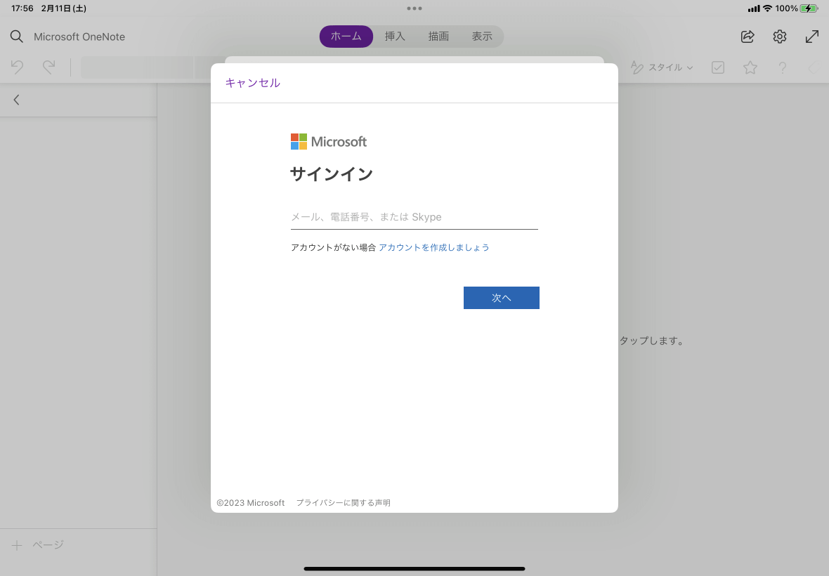 - サインイン画面が表示されたら、OneNote で使用したいアカウントのメールアドレスを入力して[次へ]ボタンをタップします。