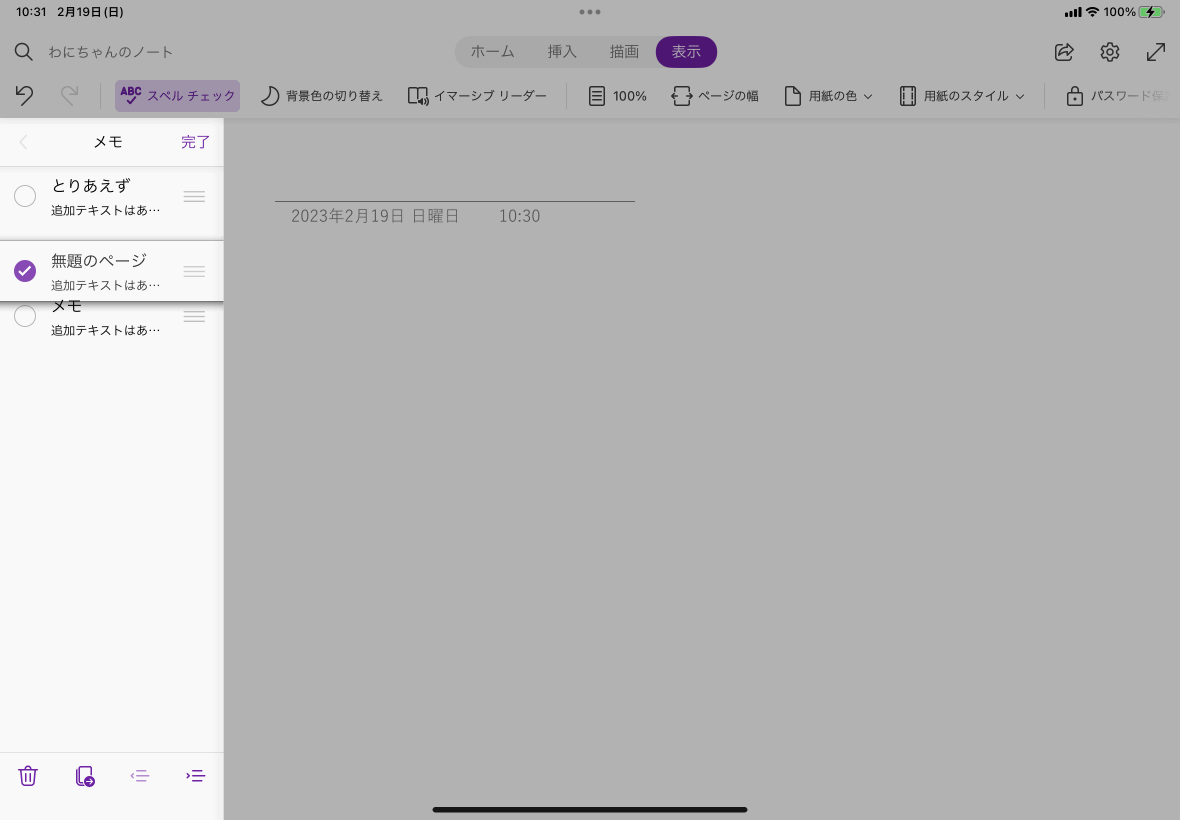 セクション内のページの順序を変更するには、ページリストの中から移動したいページをホールド(長押し)し、右端の三本線のアイコンを移動先までドラッグします。最後に[完了]をタップすると、ページの編集ができるようになります。なお、ページリスト右上の[…]から[ページを並べ替える]を選択することで、アルファベット順、作成日、更新日で並べ替えることが可能です。