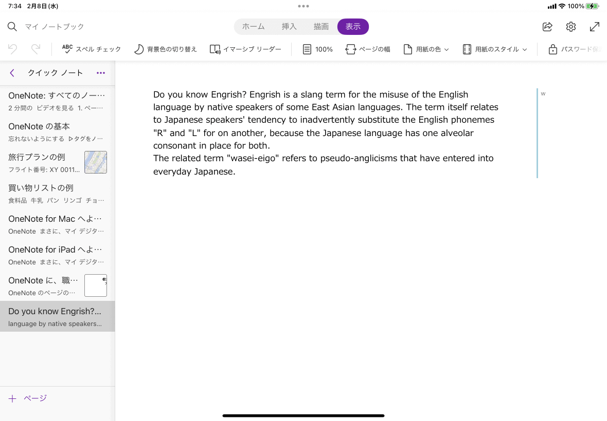 既定ではスペルチェック機能が有効になっています。煩わしい場合は無効にすることができます。[表示]タブを開き、[スペルチェック]をタップしてオフにします。