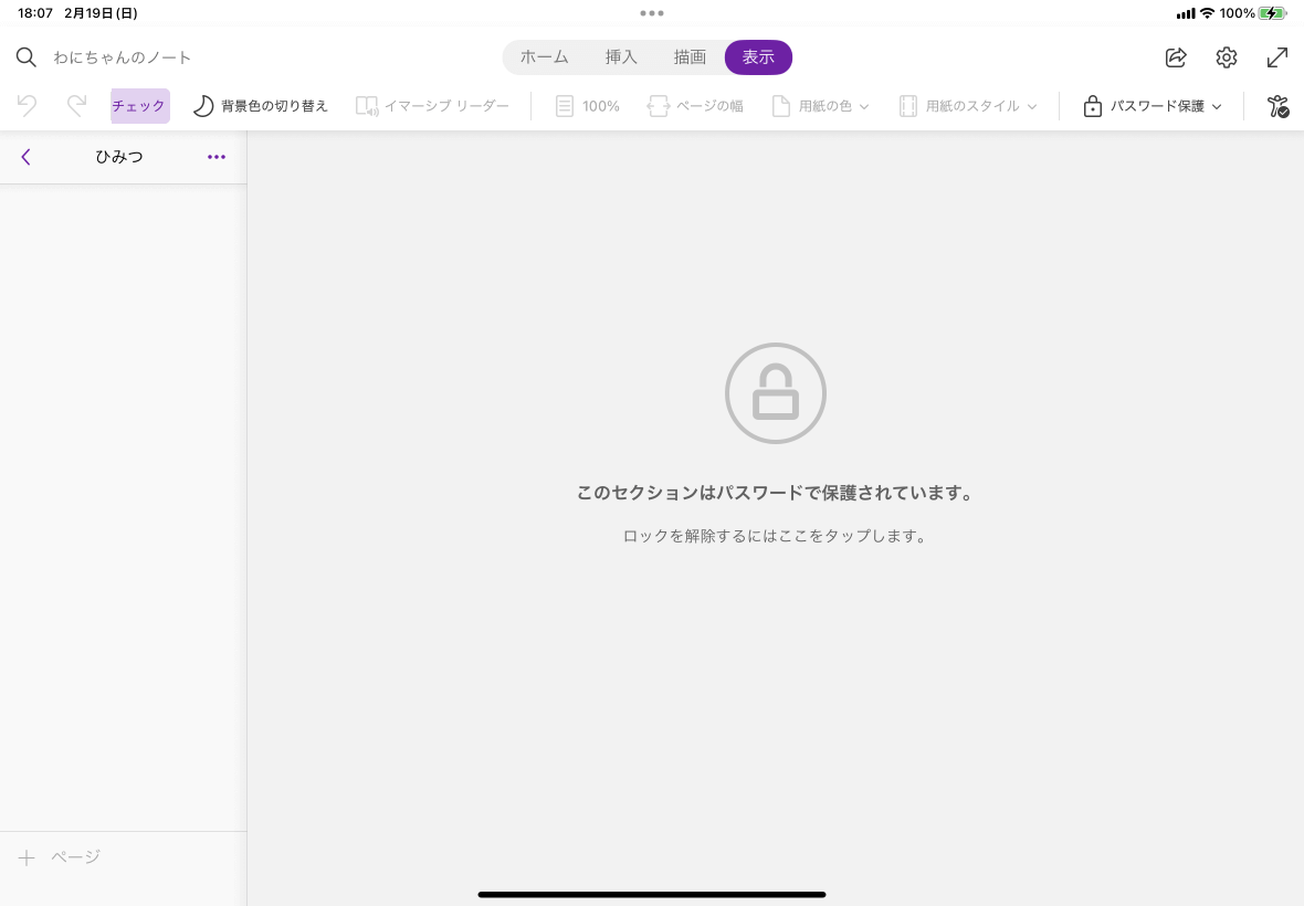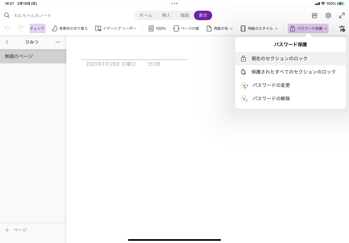 時間が経つと保護されたセクションはロックされますが、すぐにロックしたい場合は、[表示]タブを開いて、[パスワード保護]より[現在のセクションのロック]を選択します。開いているノートブックに保護されたセクションが複数ある場合は、[保護されたすべてのセクションをロック]することも可能です。