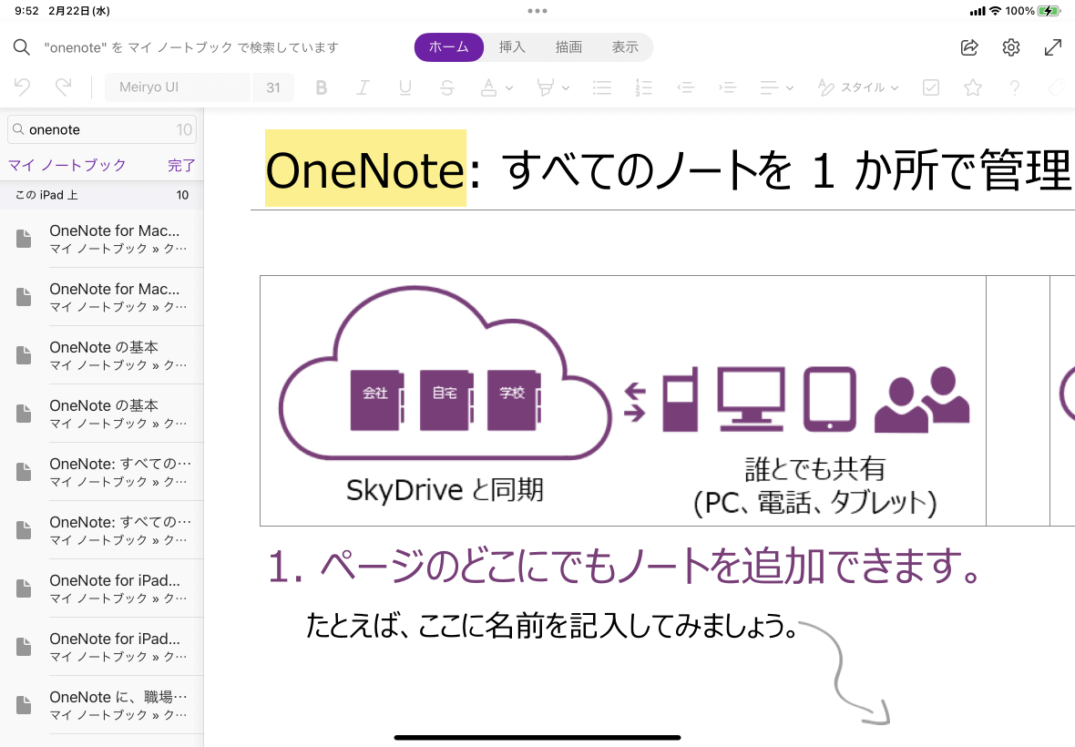 - キーワードを検索すると、[すべてのノートブック]からその文字列が含まれるページが検索され、ページ内でキーワードに一致した部分がハイライトされました。