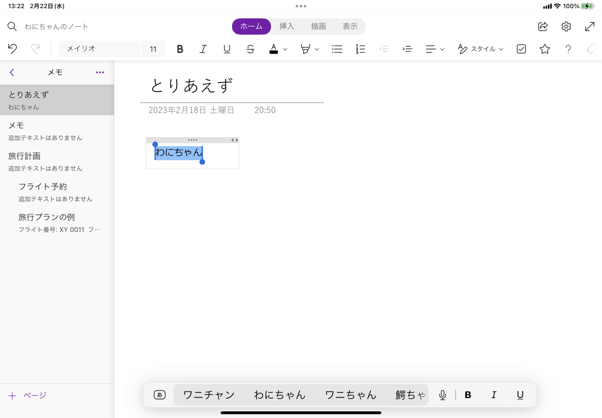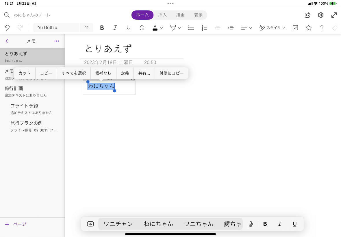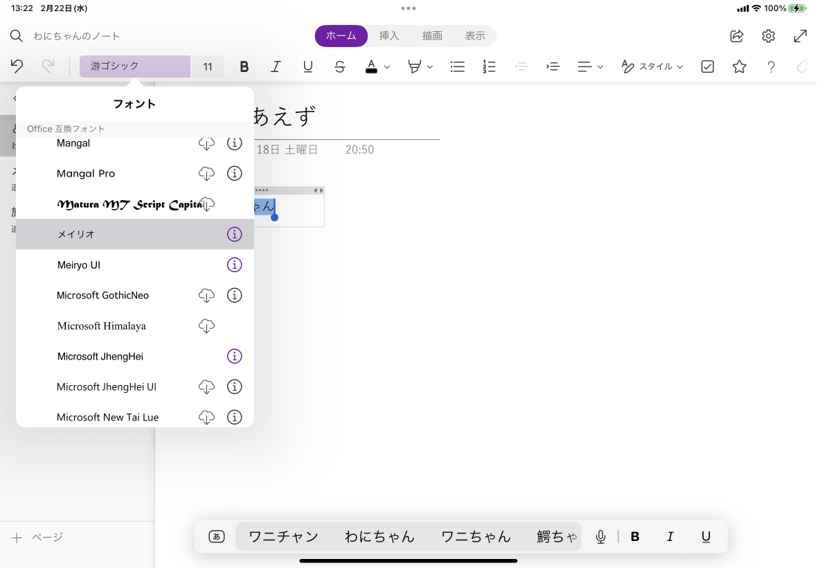OneNote for iPad既定のフォントは Yu Gothicです。これを好きなフォントに変更できます。フォントを変更したい文字列を選択して、[ホーム]タブの[フォント]ボックス一覧からフォントを選択します。ここでは、すべての文字列をメイリオに変更する方法について説明します。