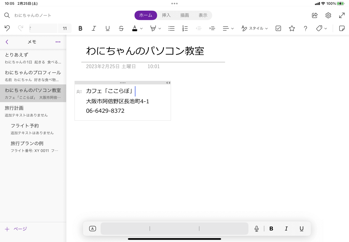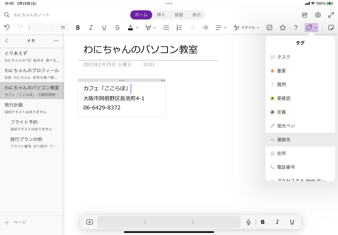 住所録やログインパスワード等をノートにまとめるために便利なノートシールには、「連絡先」「住所」「電話番号」「アクセスするWebサイト」「アイデア/ヒント」「パスワード」があります。挿入したい段落にカーソルを移動して[ホーム]タブの[タグ]一覧より選択します。