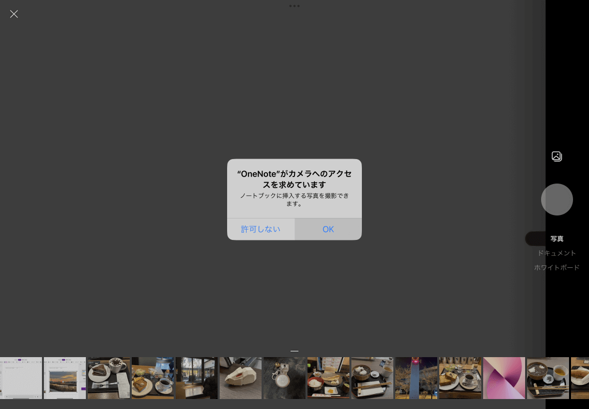 カメラアプリで撮影してページに挿入するには、挿入したい場所にカーソルを移動して[挿入]タブを開き、[カメラ]を選択してカメラアプリを起動します。最初にOneNote for iPadでカメラを使用するには許可を求めるメッセージが表示されるので[OK]を選択します。
