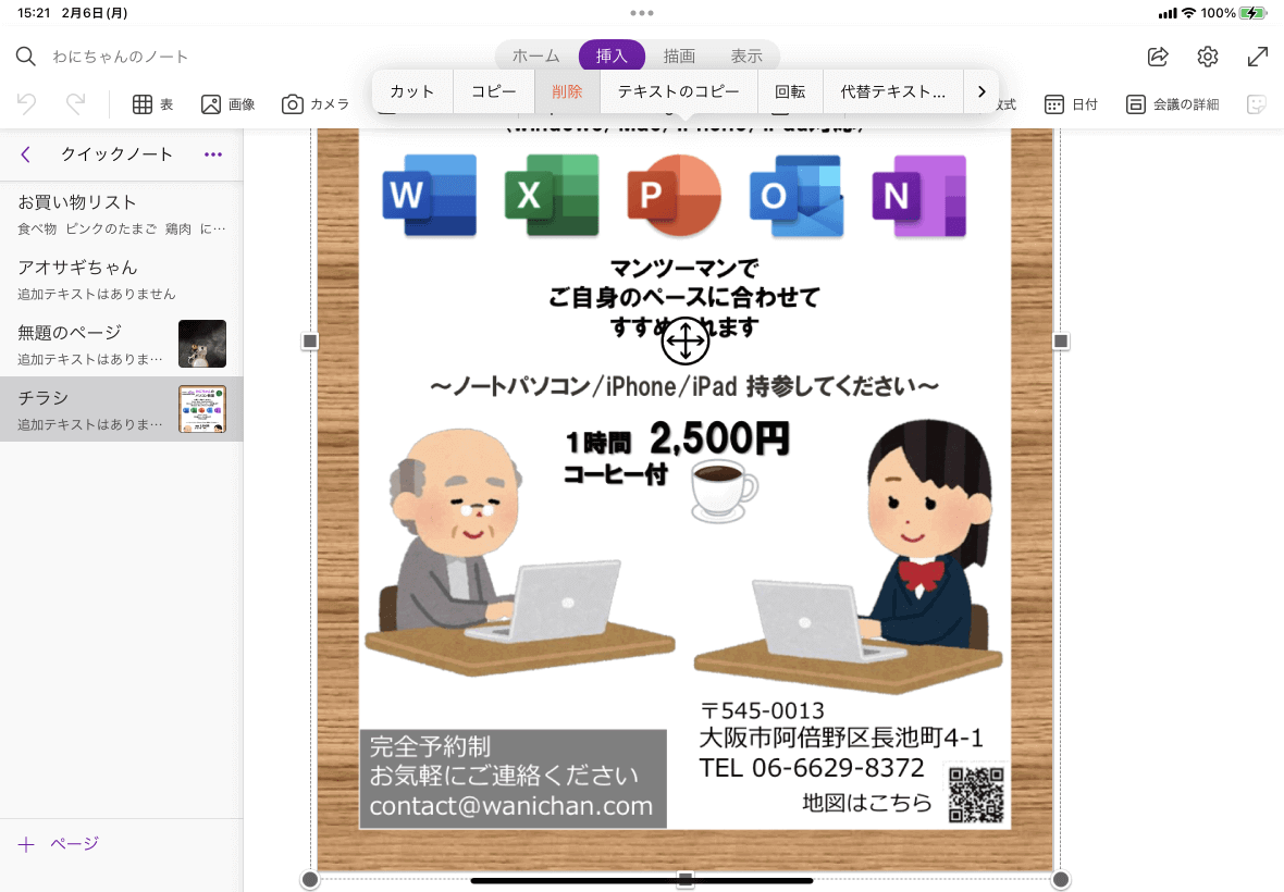挿入されたPDF印刷イメージを選択して、ポップアップメニューから[削除]を選択します。添付ファイルも削除するには、そのアイコンを選択して[削除]をすればOKです。複数ページのPDFの場合は、それぞれ印刷イメージを選択して削除していく必要があります。