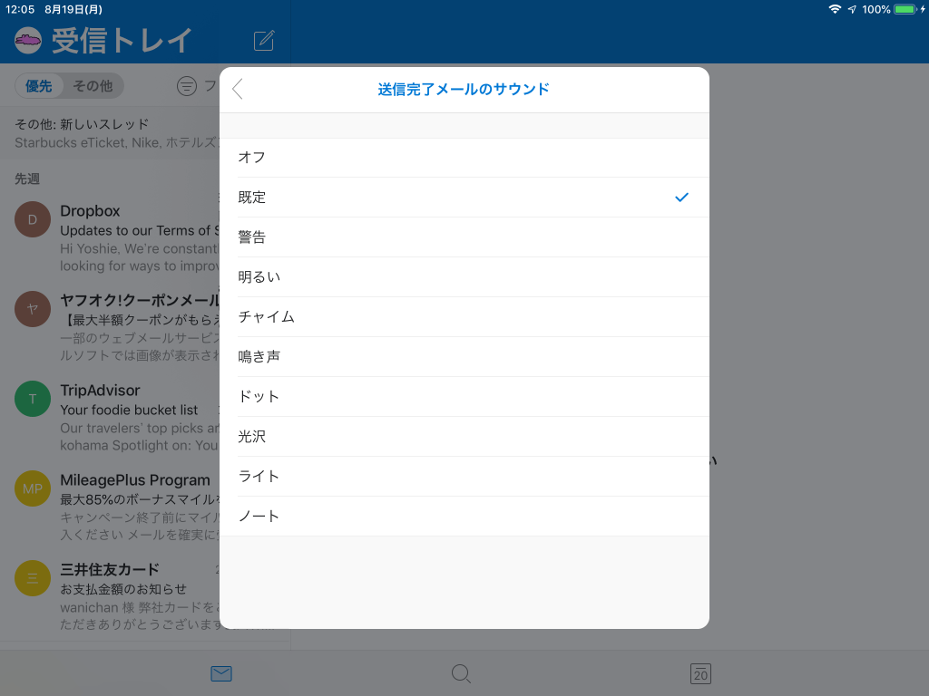 既定では、優先トレイにメールが受信した場合に通知されます。必要に応じて、すべてのメール受信時、お気に入りのユーザーのみ通知といった設定も可能です。通知サウンドを変更するには、設定画面を開き、[メール]オプションから[通知]を選択して、送信完了メールや新着メールのサウンドを選択します。