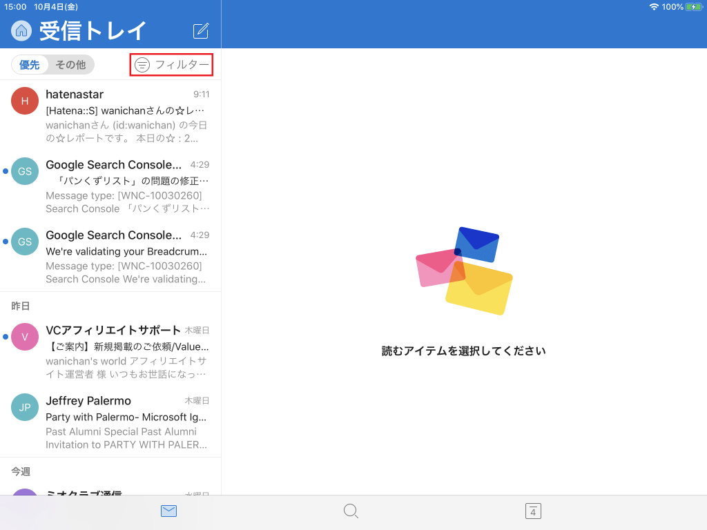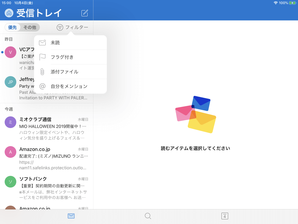 メール一覧の優先受信トレイスイッチの右側の[フィルター]をタップして、一覧から[未読][フラグあり][添付ファイル]などのメッセージのみ表示することによって、受信メールを簡単に管理できます。