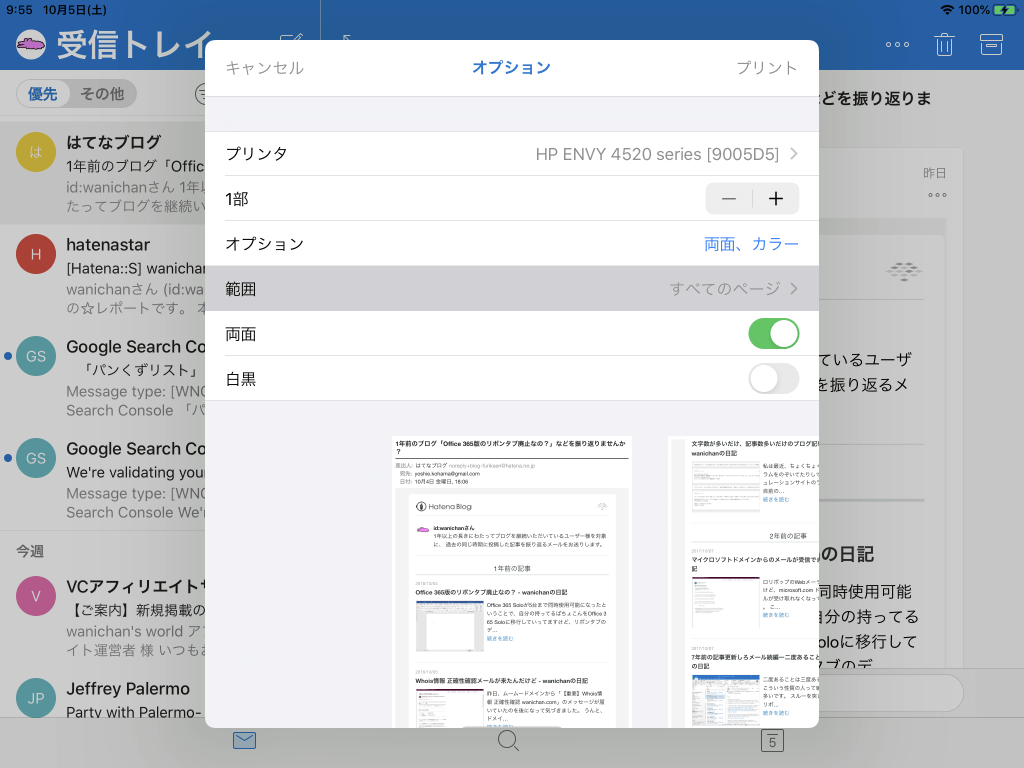 - プリンタが選択されたことを確認し、[プリント]をタップすると、印刷が開始されます。