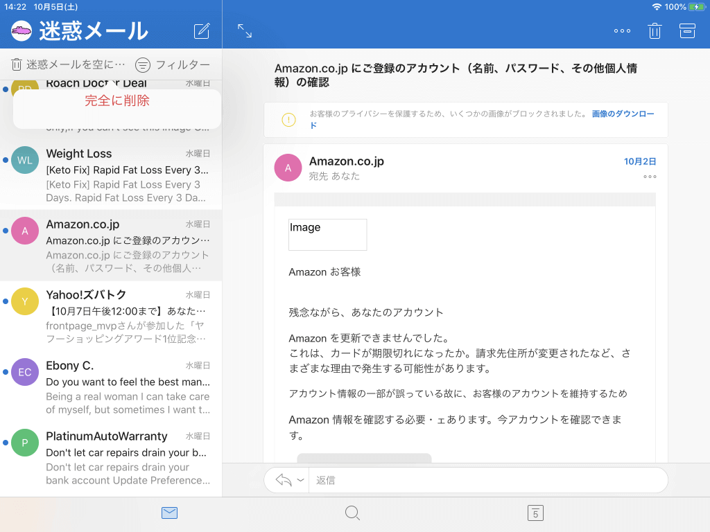 メールアカウントより迷惑メールフォルダーを選択し、[迷惑メールを空にする]をタップして、[完全に削除]ボタンをタップすることで、迷惑メールフォルダーが空になります。