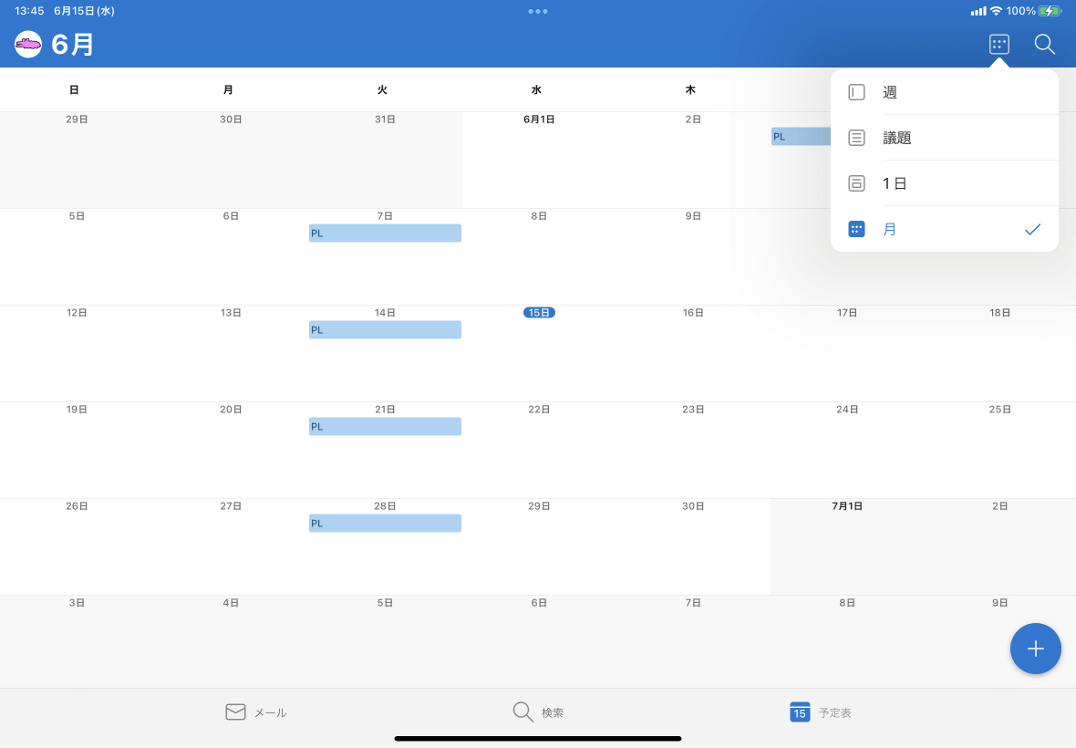 - 予定表画面右上の[表示形式]アイコンをタップします。月表示の場合は