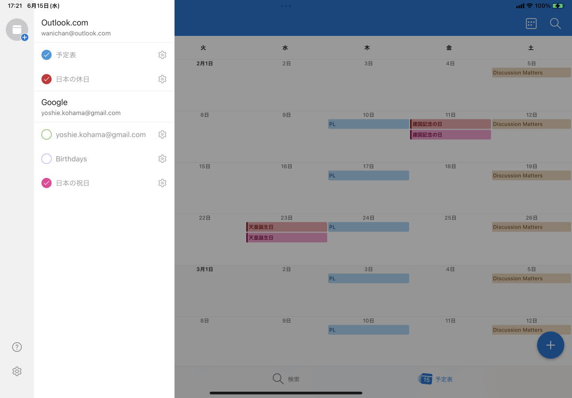 一部の予定表を非表示にするには、画面左上のアカウントのアバター(ロゴ)をタップするか、画面の左端から右方向にスワイプして、非表示にしたい予定表の色アイコンをタップします。チェックを外すことでその予定表が非表示になります。逆に表示するには、チェックを付ければOKです。
