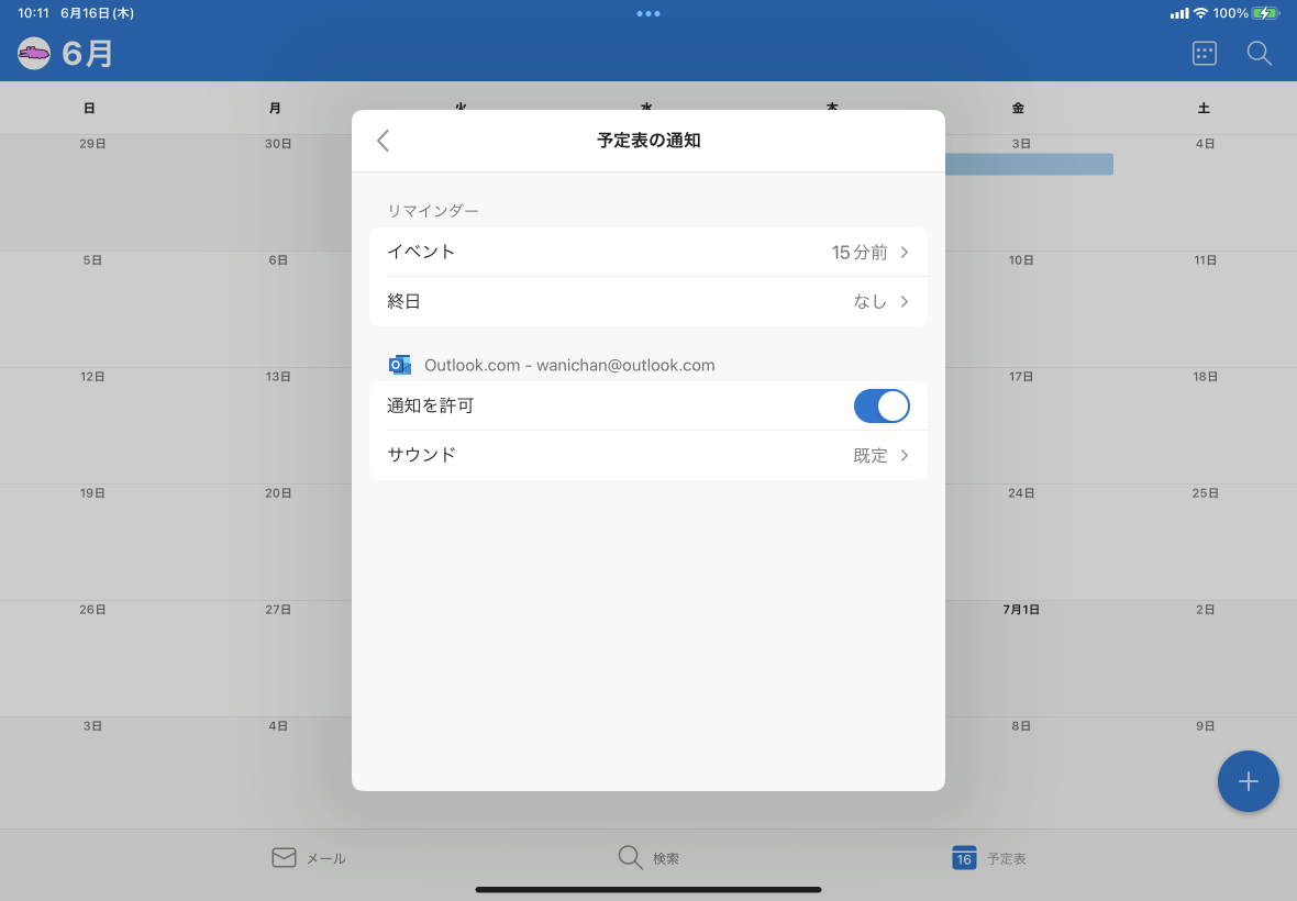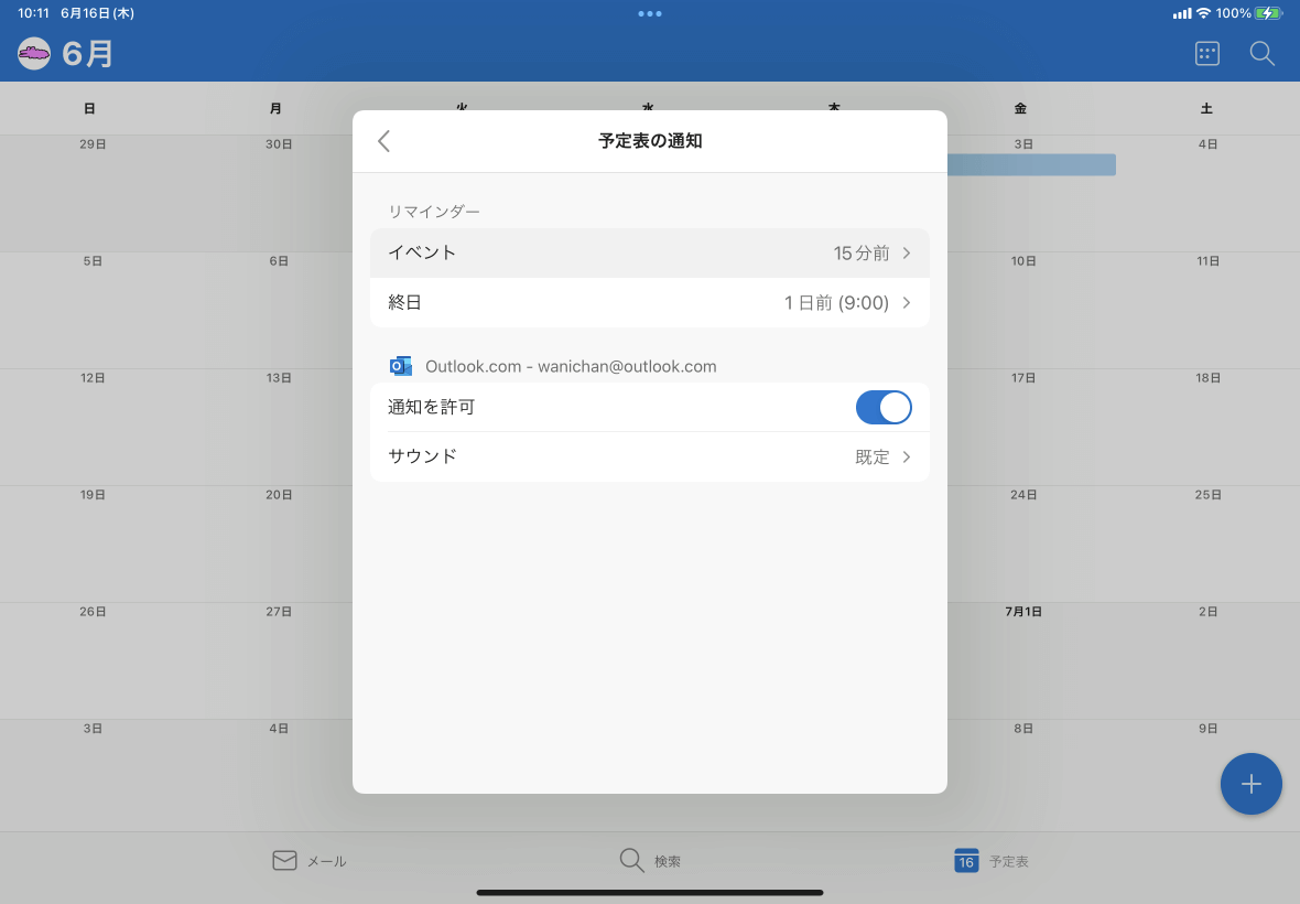 - [設定]画面の[予定表]オプションから[通知]を選択します。