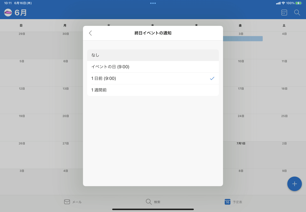 - [予定表の通知]の[通知時間]の[終日]が[なし]になりました。