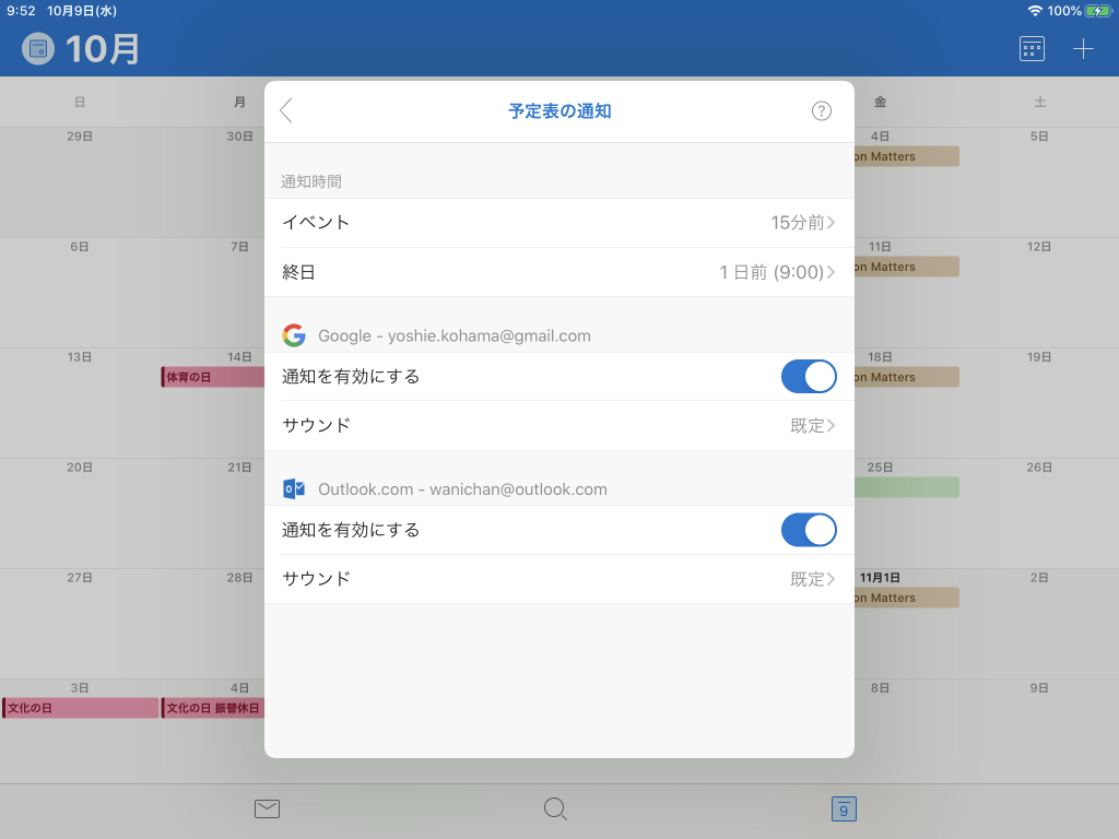 - [予定表の通知]の[通知時間]一覧より[予定表の通知]のアカウント一覧よりそれぞれのスイッチを操作します。オフにすることで、プッシュ通知をオフにできます。