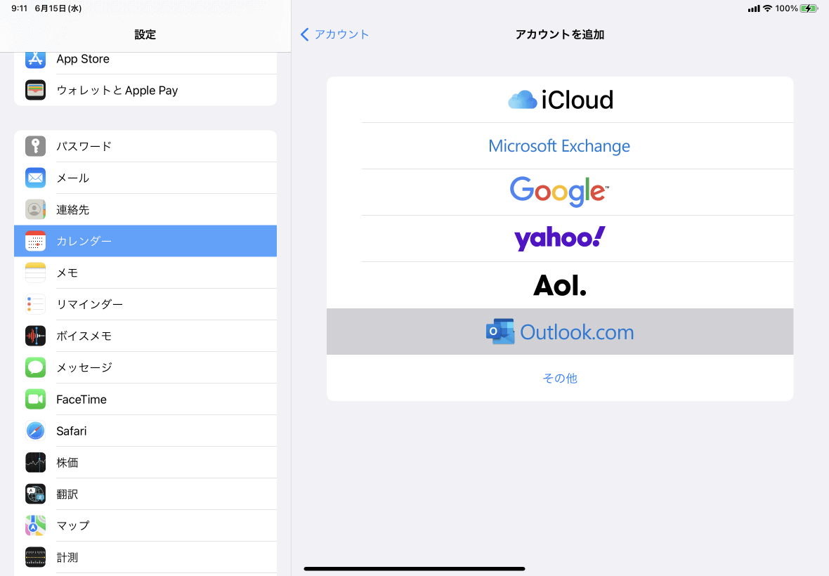 メインのカレンダーをOutlook.comにしたい、WindowsのOutlookアプリでも予定表を同期したい場合は、Outlook.comアカウントをiPad標準のカレンダーアプリに表示することが可能です。