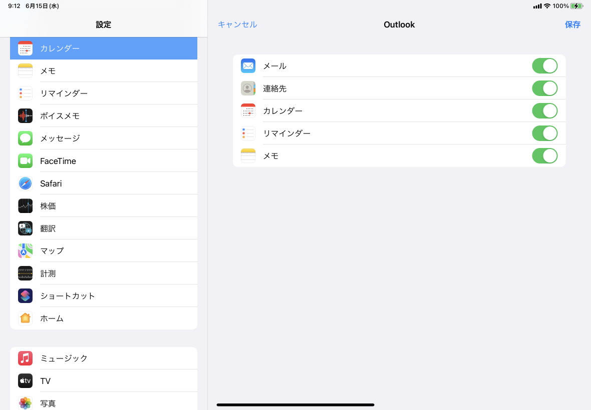iPadOS 15からはホーム画面から[設定]アイコンをタップし、[カレンダー]から[アカウント]を選択して、[アカウントを追加]を選択し、[Outlook.com]を選択してサインインするとOKです。ここで、同期する項目のスイッチを調整します。カレンダーのみ連携するには[カレンダー]のみスイッチをオンにするとOKです。