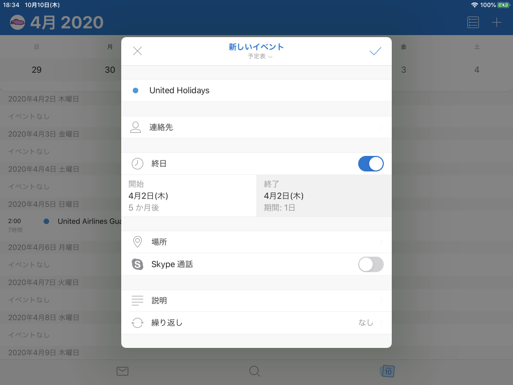 - イベントの開始日を選択します。月表示になっている場合、開始日を長押しします。