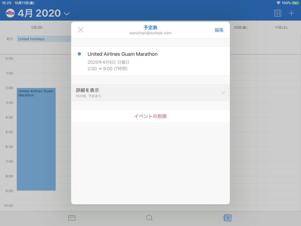 Outlook for iPadで新しいイベントを作成すると、既定では15分前、終日のイベントの場合は前日午前9時にアラームが設定されます。個々のアイテムのアラームの設定時間を変更するには、そのイベントアイテムを開き、[詳細を表示]を選択して、