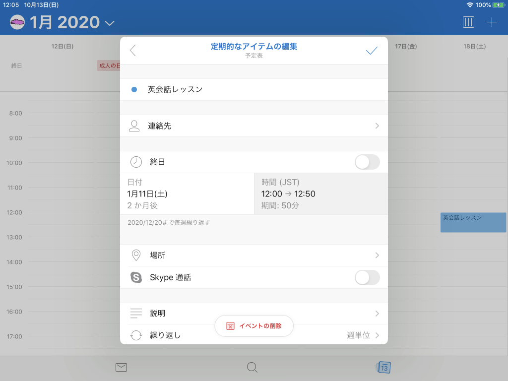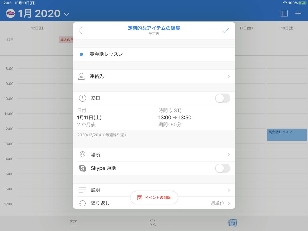 時間帯や繰り返しの終了日の変更など、定期的なアイテム全体の編集をする場合は、定期的なイベントで任意のアイテムを開き、右上の[編集]をタップして、[一連のすべてのイベントを編集]を選択します。すると、[定期的なアイテムの編集]として開くので、編集したい項目を選択して編集します。終わったら✔をタップすると編集内容が保存されます。ただし、保存すると、修正したイベントを含む、定期的なイベントの過去および未来のすべてのイベントが変更されるので注意してください。