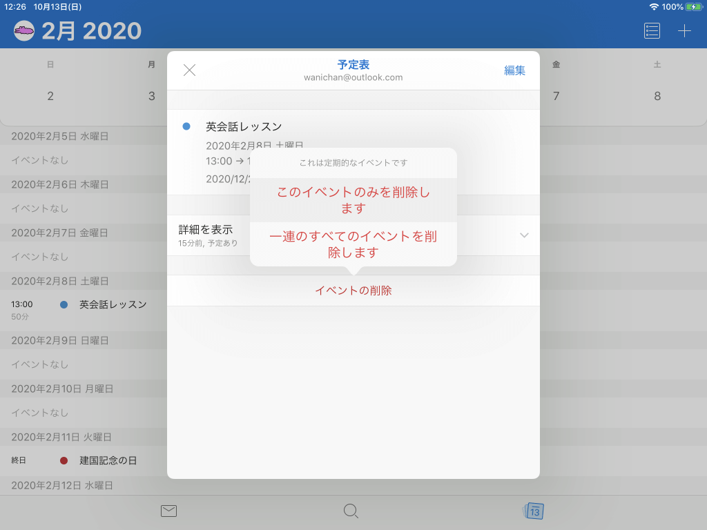 - ポップアップメニューより[このイベントのみ削除します]を選択します。