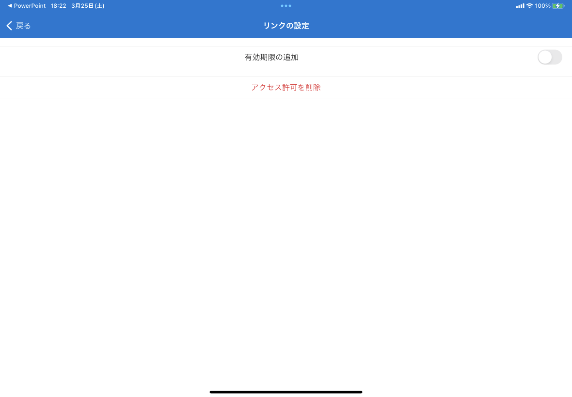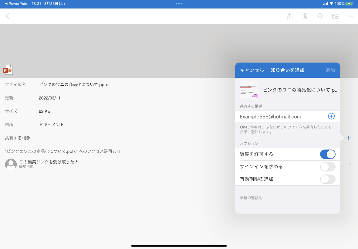 共有する相手を管理するには、OneDriveアプリを使用します。PowerPoint for iPadでは対象となるファイルの項目の右側の