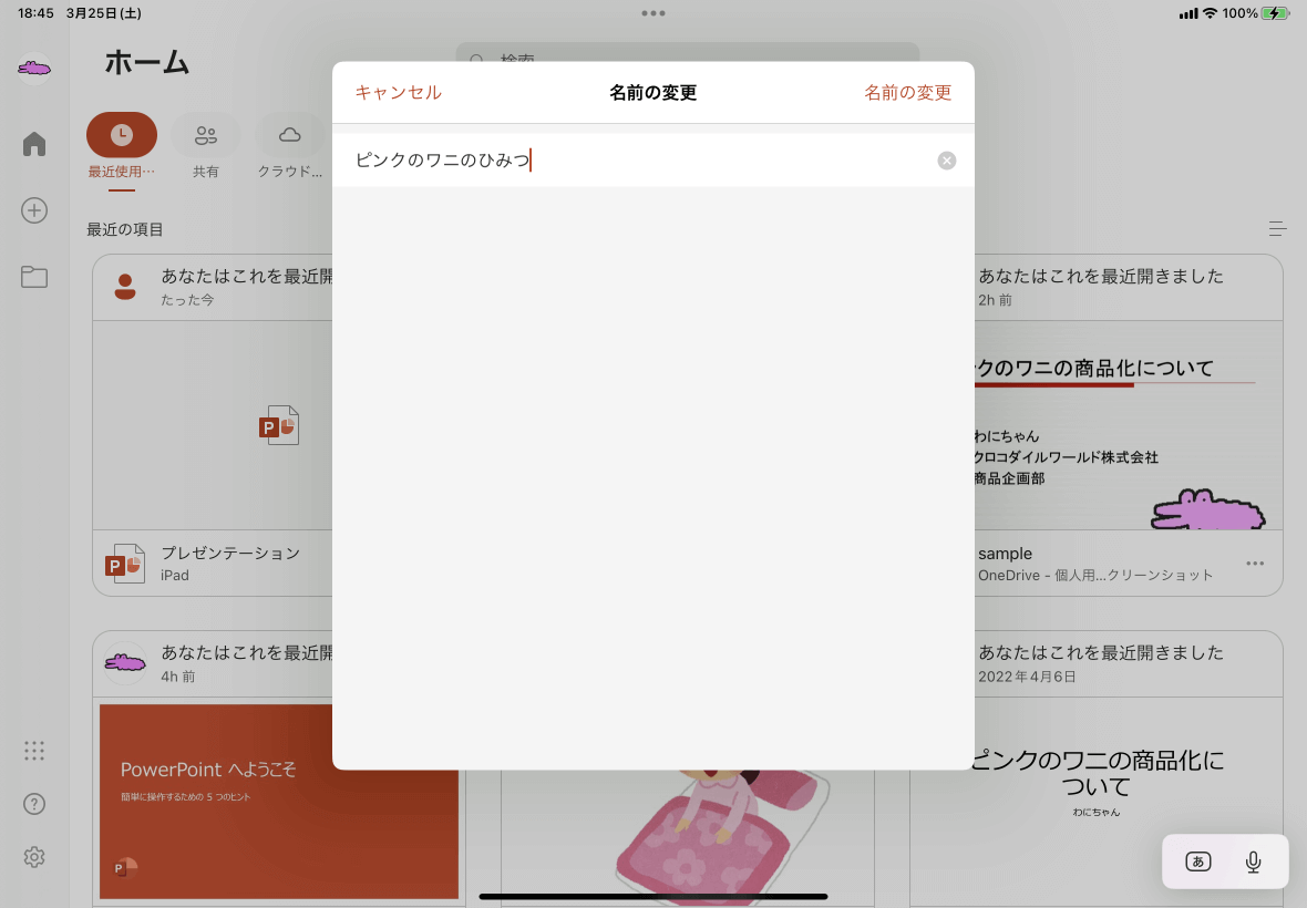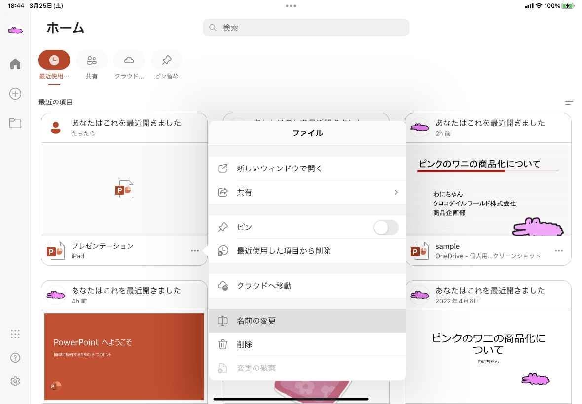 PowerPoint for iPadからでもOneDrive上のファイル名を変更できます。対象となるファイルの項目の右側の