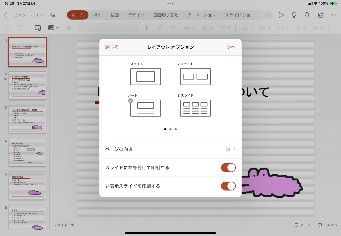 PowerPoint for iPadでの既定の印刷設定は、配布資料(1スライド)になります。ノートを印刷するには、[ファイル]をタップして[印刷]を選択し、[レイアウトオプション]一覧から[ノート]を選択します。