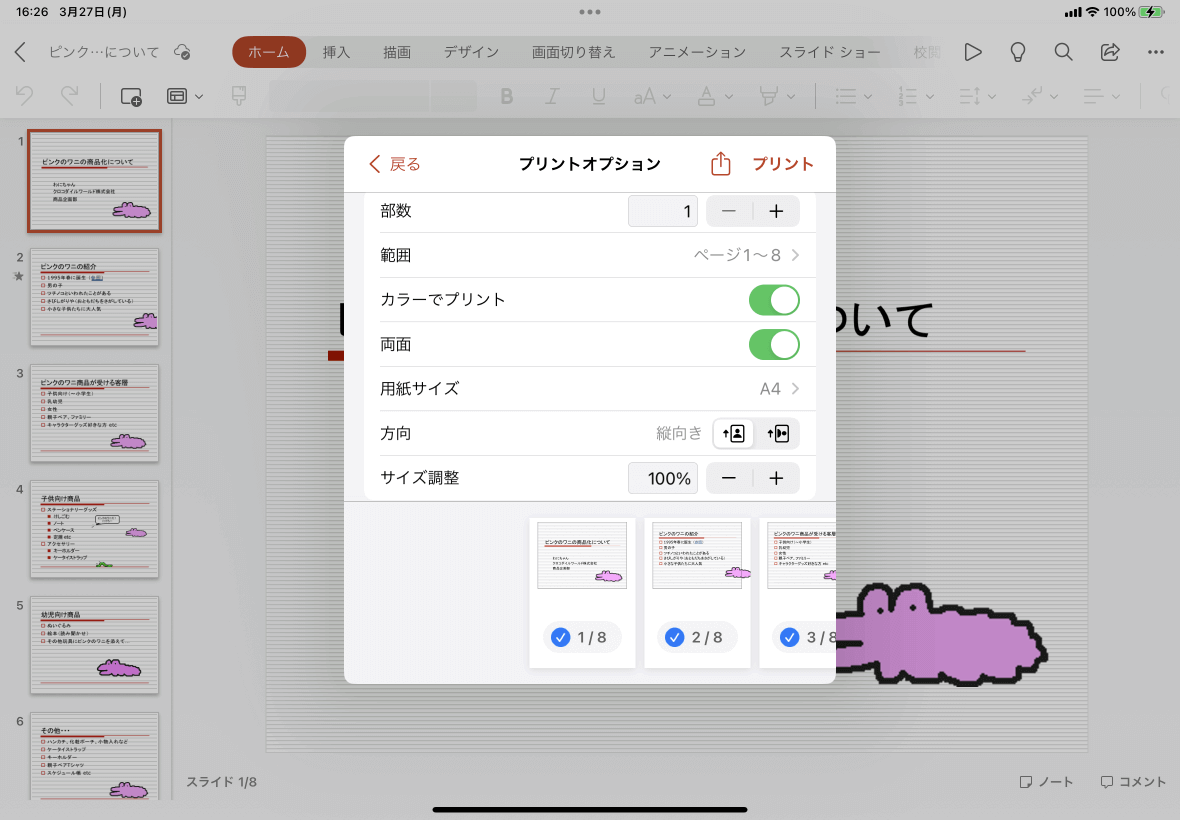 - 用紙サイズを指定して[プリント]をタップすると、印刷が開始されます。