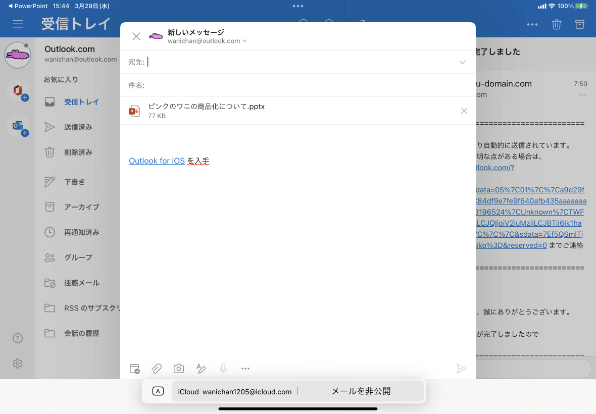 [共有]から[コピーの送信]から[Outlookでメールを送信する]を選択すると、Outlookアプリが起動して、新しいメールのメッセージにそのプレゼンテーションのコピーが添付されます。